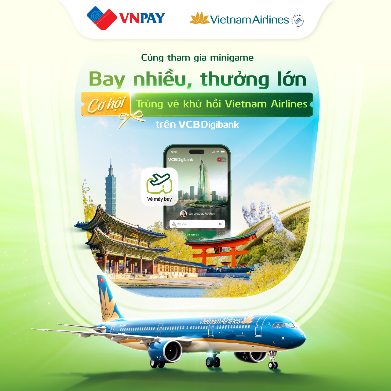 Từ 06/11 đến 31/12/2025, khách hàng đặt vé máy bay ngay trên VCB Digibank sẽ có cơ hội nhận 01 vé khứ hồi Vietnam Airlines đến bất kỳ điểm đến nào. Càng bay nhiều, cơ hội trúng thưởng càng lớn!