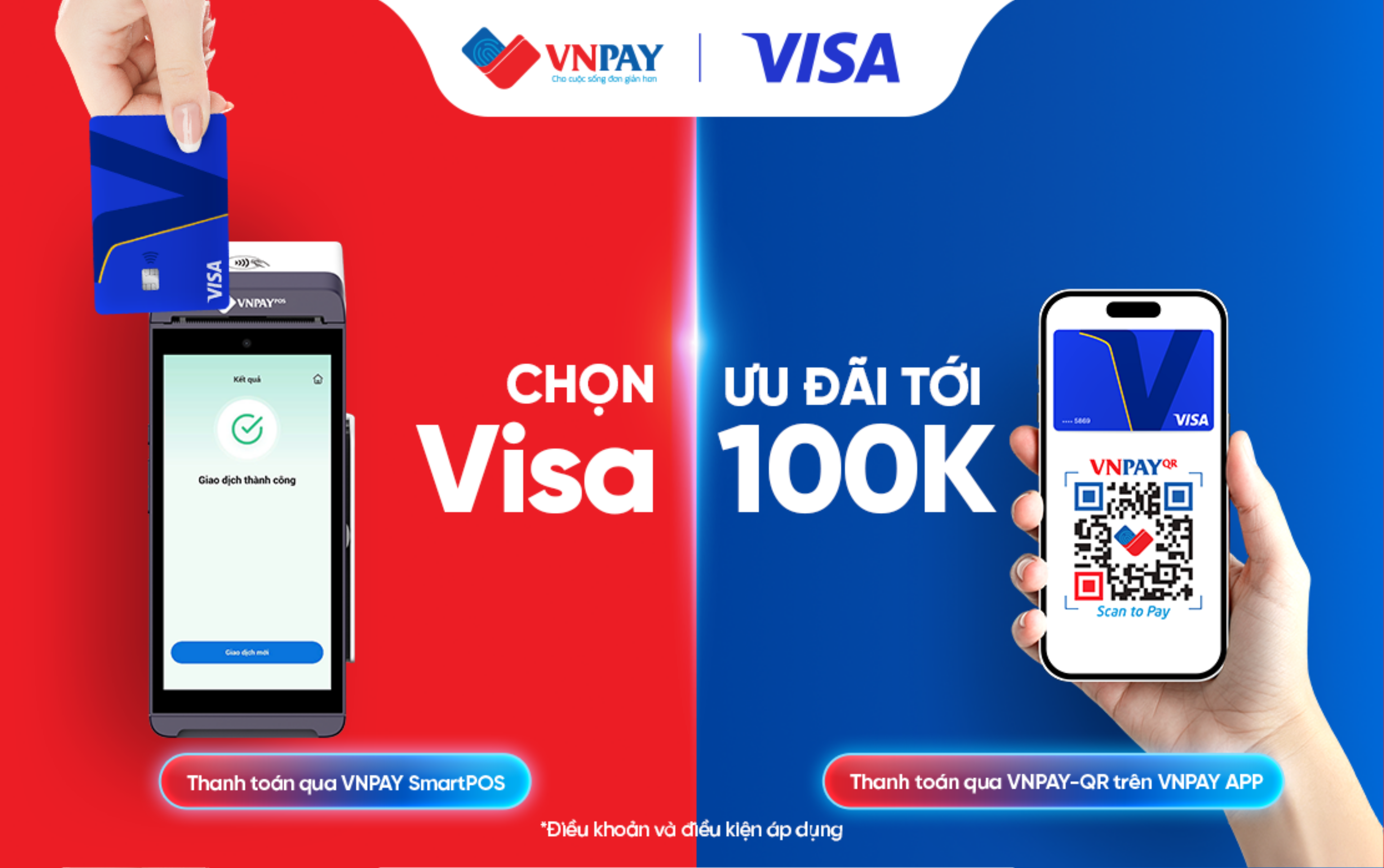 VNPAY phối hợp cùng Visa tiếp tục triển khai ưu đãi giảm tới 100.000 đồng cho các giao dịch thanh toán bằng thẻ Visa qua VNPAY-QR và VNPAY SmartPOS