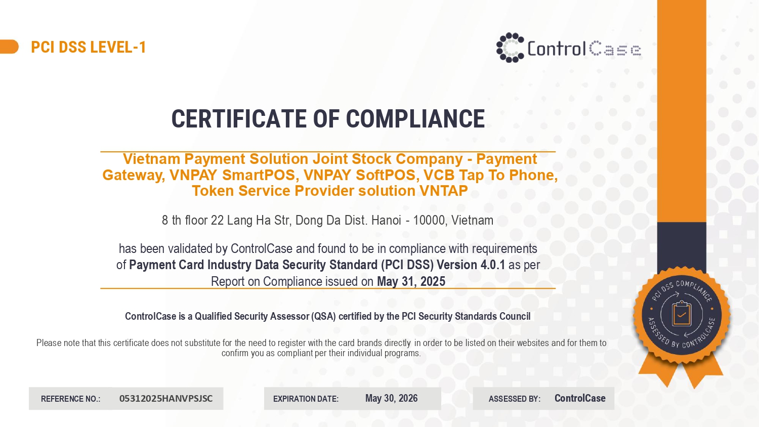Trong thời đại mà các rủi ro an ninh mạng ngày càng tinh vi, bảo mật là yếu tố không thể xem nhẹ. Cổng thanh toán VNPAY đã hoàn tất quá trình đánh giá và chính thức nhận được Giấy chứng nhận tuân thủ (Certificate of Compliance - CoC) theo tiêu chuẩn PCI DSS phiên bản 4.0.1 mới nhất, do ControlCase (Hoa Kỳ) – tổ chức đánh giá được Hội đồng Tiêu chuẩn Bảo mật PCI (PCI SSC) công nhận – cấp. Chứng chỉ PCI DSS là một tiêu chuẩn an ninh thông tin bắt buộc dành cho các doanh nghiệp lưu trữ, truyền tải và xử lý thẻ thanh toán. Được quản lý bởi 5 tổ chức thanh toán quốc tế: Visa, MasterCard, American Express, Discover và JCB, PCI DSS đại diện cho cấp độ cao nhất trong việc bảo vệ dữ liệu thẻ thanh toán của nhà cung cấp dịch vụ. Nhờ vậy, VNPAY luôn đảm bảo mọi giao dịch đều được mã hóa và giám sát chặt chẽ. Hệ thống bảo mật đa tầng giúp bảo vệ tuyệt đối dữ liệu của doanh nghiệp và khách hàng, ngăn chặn gian lận, giả mạo thanh toán và xây dựng niềm tin vững chắc cho người dùng.
