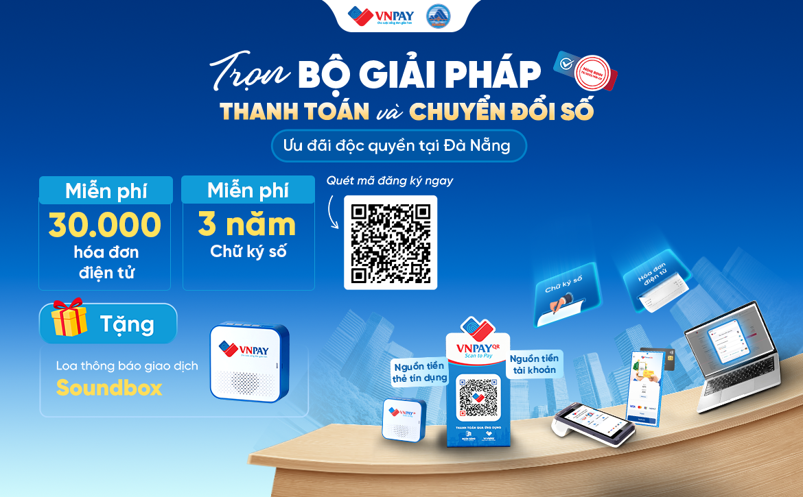 Đặc biệt, VNPAY hiện đang triển khai gói ưu đãi đặc thù dành riêng cho các doanh nghiệp, hộ kinh doanh tại Đà Nẵng: Miễn phí 30.000 hóa đơn điện tử, 3 năm gói chữ ký số HSM và tặng loa thông báo giao dịch. Nhờ bộ giải pháp tích hợp, doanh nghiệp và hộ kinh doanh có thể vận hành liền mạch từ thanh toán đến xuất hóa đơn, đồng thời áp dụng chuẩn mực mới về chứng từ điện tử một cách nhanh chóng và hiệu quả.